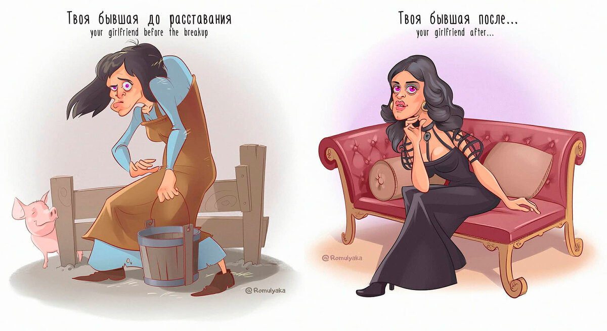 И как так получается, что бывшие после расставания чудесным образом преображаются – причем, как правило, в лучшую сторону?! Позлить нас что ли хотят? Художник из Перми шутит на разные темы, в том числе и об отношениях – несмотря на то, что уже много лет счастливо женат. Ну а что? Зачем ограничивать спектр идей для юмора? Роман Хуснуллин провел детство в Набережных Челнах и в школе охотно рисовал карикатуры на учителей и одноклассников. Это хобби стало увлечением на всю жизнь. Парень окончил художественно-графический факультет Бирского педуниверситета, но учителем ИЗО работать не пошел. Вместо этого занялся наружным рекламным бизнесом в Перми. Сам рисовал вывески, сам делал их и монтировал. А параллельно рисовал карикатуры для души. Творчество Ромуляки (псевдоним художника в сети) отличает исключительный позитивный настрой. Никакой язвительности, никакого черного юмора, всё по-доброму, но не пресно. Подписчики в паблике автора в ВК прибывают медленно, но свой круг фанатов уже сложился.