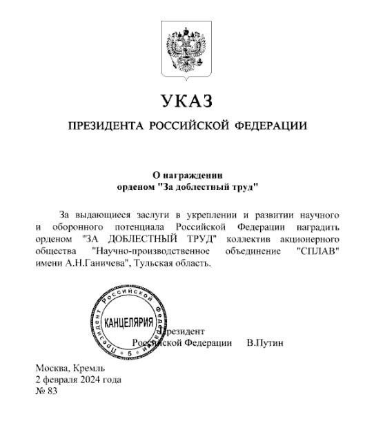 Награды удостоился коллектив НПО «СПЛАВ» им. Ганичева, который находится в Тульской области. Это предприятие производит ракетные системы залпового огня - «Град», «Ураган», «Смерч», которые активно используются в зоне СВО в Украине.