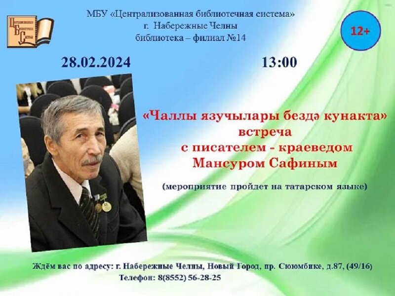 28 февраля в Библиотеке-филиале №14 г. Набережные Челны состоится встреча с членом Союза писателей России и Татарстана, лауреатом литературно-краеведческих премий имени Шайхи Маннура и Егора Уткина, профессиональным журналистом и писателем – Мансуром Габдулловичем Сафиным. У ребят появится прекрасная возможность познакомиться и пообщаться с интересным человеком и талантливым автором. На творческой встрече Мансур Сафин расскажет молодым людям о себе, о своём творчестве, о создании своих произведений, о профессии журналиста. На мероприятии прозвучат стихи поэта, песни, написанные на его слова.