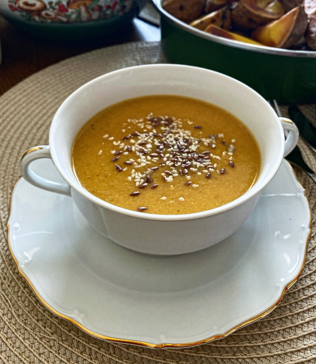 Полезные свойства Тыква – источник витаминов А, С, Е, К, Т, а также группы В, богата магнием, марганцем, цинком. Хороший продукт для сердца, кожи, суставов, зрения, иммунитета. Ингредиенты Куриные бедра – 4 шт. Тыква – 1 шт. среднего размера. Репчатый лук – 1 шт. Масло ГХИ – 4 ст. л. Оливковое масло - 1 ст. л. Кунжутное масло/грецкого ореха - 1 ст.л. Соль – по вкусу. Любимые приправы – по вкусу. Семена для подачи. Приготовление В кастрюле заливаем куриные бёдра холодной водой, доводим до кипения (можно использовать другие части, но именно бёдра дают наваристость). Если мясо птицы было куплено в магазине, то первую партию воды сливаем. Снова заливаем куриные бёдра холодной водой, добавляем соль по вкусу, доводим до кипения на сильном огне/максимальном режиме, затем ставим на средний огонь/средний режим до готовности. После достаём куриные бедра, остужаем, отделяем мясо от костей, бульон при этом оставляем кипящим. На сковороде растапливаем 1 ст. л. масла ГХИ, добавляем как угодно нарез
