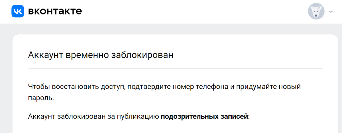 Аккаунт заблокирован за публикацию подозрительных записей