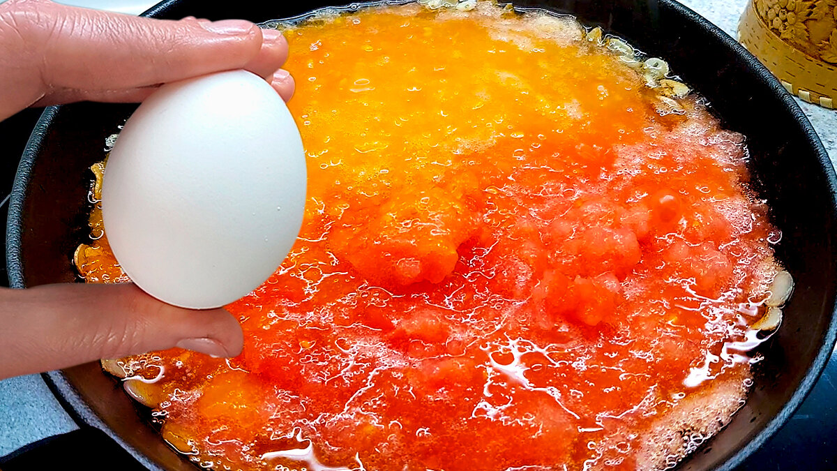 Пока помидоры тушатся разбить яйца в миску и хорошо взболтать