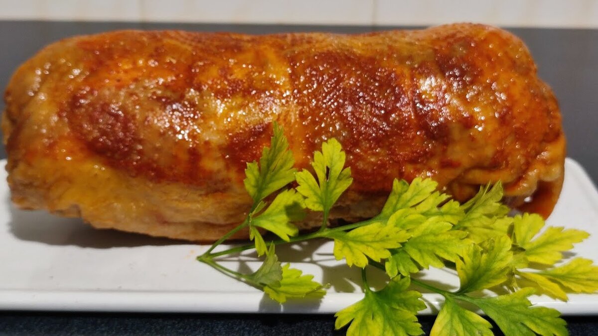 1. Разрежьте рукав для запекания на две части и выложите на рабочую поверхность стола, присыпте паприкой. 2. Положите на паприку куриную кожу, разровняйте её. Курицу выложите на кожу, разровняйте и туго заверните в рукав для запекания, формируя рулет. Концы