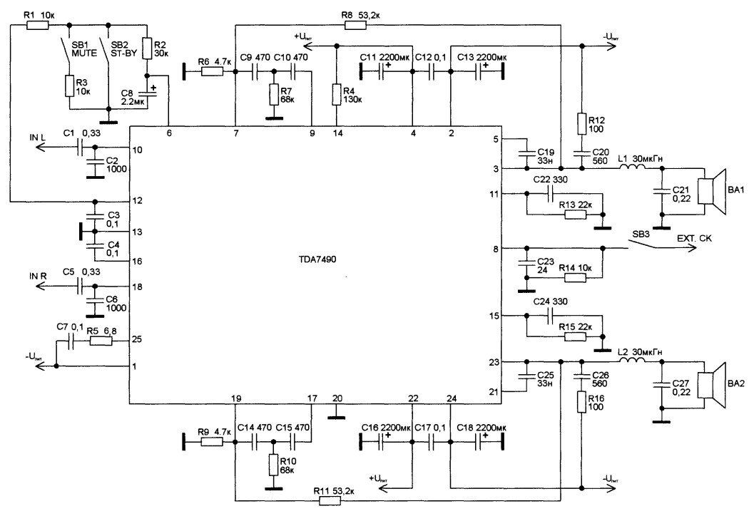 Как и обещал прошлой части цикла, сегодня мы поговорим о двухканальных микросхемах цифровых УНЧ класса D. TDA7490 Микросхема представляет собой двухканальный интегральный цифровой усилитель звуковой частоты класса D. Чип выполнен в корпусе Flexiwatt 25, основная область применения — бытовая и телеаппаратура. Есть защита от перегрузки и короткого замыкания по выходу, перегреву, перенапряжению. Развивая выходную мощность в 2х20 Вт, микросхема не требует радиатора. Питание двуполярное, есть режим ожидания и беззвучный режим, режим внешней синхронизации, режима работы моста. Характеристики: Типовая схема включения: Печатная плата (сторона 1 и 2): Расположение элементов: TDA8920J Микросхема представляет собой двухканальный интегральный цифровой усилитель звуковой частоты класса D. Чип выполнен в корпусе SOT 234-1, основная область применения — бытовая и телеаппаратура. Есть защита от перегрузки и короткого замыкания по выходу, перегреву. Развивая выходную мощность в 2х35 Вт, микросхема не