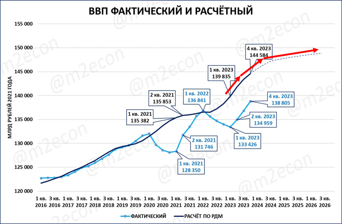 Мои читатели видят, как ЦБ резко снижает темпы роста реальной денежной массы. И спрашивают: как же это стыкуется с тем, что ВВП в 2024 году будет расти хорошими темпами? Разберёмся. ЦБ задаёт динамикой реальной денежной массы потенциальный объём ВВП. Его легко рассчитать из реальной денежной массы, на графике ниже он обозначен как расчётный ВВП ("Расчёт по РДМ"). И именно этот расчётный ВВП из-за денежного зажима ЦБ начинает замедляться (красные стрелки становятся всё более пологими). Фактический ВВП (голубая линия на графике) в обычной ситуации следует за расчётным. Во время шоковых ситуаций (ковид, СВО) фактический ВВП на время отклоняется от расчётного. Но затем он возвращается на расчётную траекторию (зелёные стрелки на графике ниже). Теперь мы можем объяснить, почему ВВП может не замедляться, при том, что ЦБ реальную денежную массу уже замедляет (график ниже). ЦБ зажимает рост (красная стрелка становится пологой), но фактический ВВП продолжает расти быстро (зелёная стрелка п