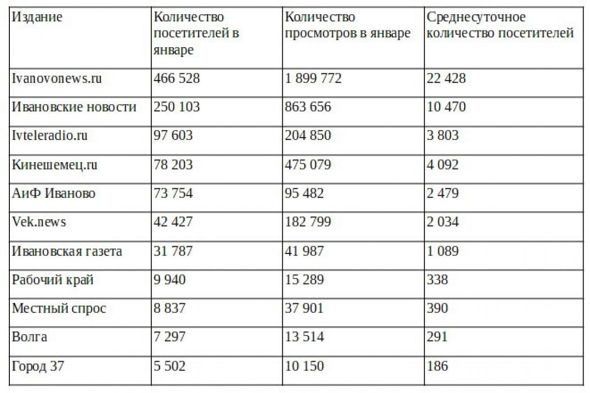 Ассоциация новостных сайтов составляет рейтинги электронных СМИ в регионах-партнерах. Подготовлен рейтинг ивановских электронных СМИ за январь 2024 года. Для составления рейтинга используются данные ведущего сервиса интернет статистики liveinternet.ru, предоставляющего наиболее понятные и разнообразные инструменты сбора, обработки и последующего анализа данных. Но данный счетчик открыт не у всех СМИ, поэтому в рейтинг включены только те СМИ, чьи данные по счетчику имеется возможность проверить. Добавим, что места в рейтинге распределялись по количеству посетителей за месяц. По сравнению с декабрем, в январском рейтинге произошли некоторые изменения. Издание АиФ Иваново опустилось на две позиции. Сетевое издание «Ивановские новости», являющееся членом Ассоциации, предоставило данные по самым читаемым материалам в январе. Наибольший резонанс вызвала новость о смерти дальнобойщика из Татарстана на платной стоянке в Ивановской области. Также большое количество просмотров набрал материал с