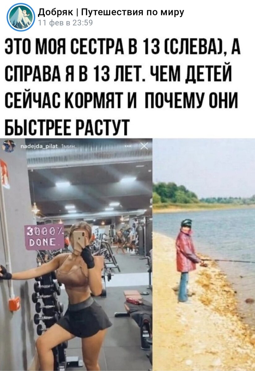- Ой, а почему дети сейчас так быстро растут...Я вот в 13 была прям ребенком-ребенком, почти бесполой. А моя сестра - "вот такая", чем же ее кормят. Увидела я на днях вот такую картинку в соцсети. Знаете, какая у меня первая мысль была? Ну, если культурно: "Привирать - не мешки ворочать". С другой стороны...с другой - вспомнила себя. Да, кубиков у меня не было, на физкультуре я была самой задохлистой, если бы мне ставили оценки "как есть" - там по большинству нормативов даже до тройки не дотягивало. Но из-за того, что училась очень хорошо - каким-то волшебным образом стояли там 4 и 5. Но отвлеклась. Если бы меня сфоткал в мои 13 с определенного ракурса, в такой одежде, в такой позе - то вышло бы что-то похожее. Разве что без кубиков. Ну может не в 13, но в 14 уж точно. А ещё меня в 13 так же могли сфоткать в пуховике на 2 размера больше, в шапке, без позирования, выгодного света и прочего. И, не поверите, я бы выглядела точно так же, как на втором фото. Абсолютно один и тот же челове