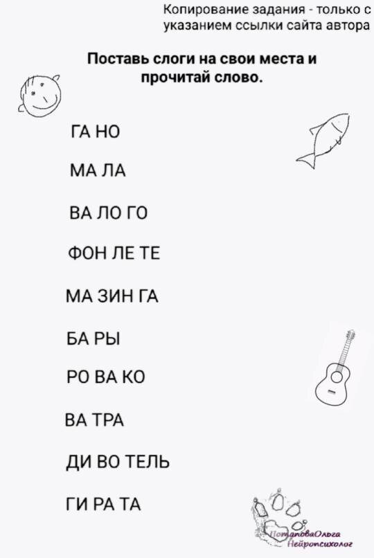 Продолжим приводить примеры заданий для профилактики дисграфии у ребенка и для домашних занятий с ребенком, если у него наблюдаются регуляторные трудности. ✅ При усвоении понятий "гласная и согласная", при успешном нахождении гласных в словах, разбираем правило: сколько в слове гласных, столько и слогов. Прохлопываем слова по слогам (один слог - один хлопок). С маленькими детьми можно обыграть задание с игрушками, наклейками. Наклеиваем наклейки с картинками к нужному домику. Первый домик: слова, в названии которых один слог, второй - два слога. Затем добавляем 3 слога, 4. В зависимости от подготовленности и возраста. ✅ Перепутанные слова. ✔️ Даем слова с перепутанными слогами, ребенок должен восстановить слово. Например: ГА-НО. Должно быть: НО-ГА. Потом покажите, что есть слова, в которых, как не переставляй слоги, а слово не изменится: МА-МА, ПА-ПА. А можно не подсказывать, а спросить самого ребенка: "А какое слово ты можешь назвать, в котором, как не переставь слоги, а оно не изме