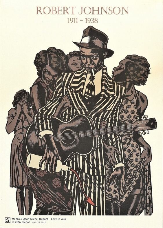 Американский блюзовый музыкант и один из самых известных исполнителей дельта-блюза. Его жизнь и карьера были короткими, но оказали огромное влияние на мировую музыкальную сцену. Джонсон родился 8 мая 1911 года в Хейзелхёрсте, штат Миссисипи и скончался 16 августа 1938 года в Гринвуде, штат Миссисипи, США . Начал играть на гитаре ещё в юном возрасте. Он путешествовал по региону, играя на улицах и в барах, привлекая внимание своим уникальным стилем игры. Его музыка сочетала в себе элементы блюза, кантри и госпела. Он считался одним из самых талантливых гитаристов своего времени. Однако, коммерческий успех Джонсона пришёл только после его смерти. Он записал всего 29 песен в течение своей короткой жизни. Ключевые инструменты Роберта Джонсона - это акустическая гитара. Он играл на стальных струнах, используя технику Bottleneck (игра на гитаре с помощью стеклянного горлышка от бутылки). Его игра отличалась скорострельностью, сложными ритмическими фигурами и необычными аккордами. Джонсон соз