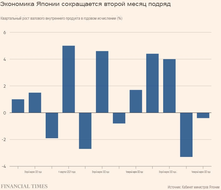 Что говорит Bloomberg Economics...«Неожиданное сокращение ВВП в четвертом квартале приводит Японию к технической рецессии и вызывает серьезные сомнения в том, выполнит ли Банк Японии сигналы, которые он послал в январе, указывая на быстрый отход от своей текущей политической позиции».— Таро Кимура, экономист.