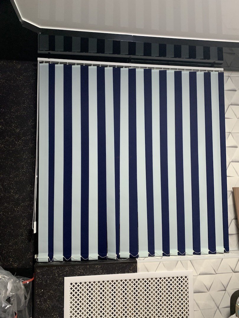 Вертикальные жалюзи с чередованием голубого и синего цвета.