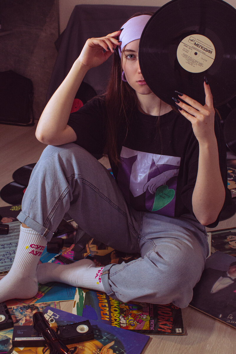 Ретро фотография с виниловыми пластинками касетами и фотографической пленкой