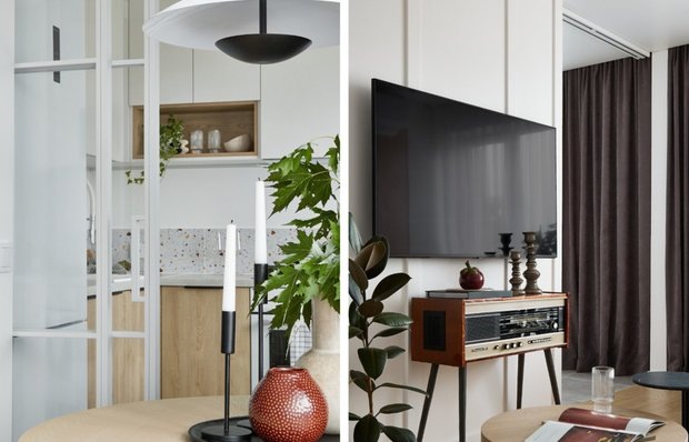 Рассказываем, как с помощью простых деталей создать яркий, запоминающийся интерьер Дизайнер Виолетта Колтан оформила свою двухкомнатную квартиру 42 кв. м в хрущевке. Она применила интересные дизайнерские решения, за счет чего интерьер получился функциональным, душевным и уютным. Рассказываем, какие идеи можно взять на заметку и реализовать в своем доме. Верхние фасады гарнитура выполнены в белом цвете, нижние — в оттенке светлого дерева. Такое классическое сочетание создает атмосферу легкости, простоты, естественности и выигрышно смотрится в малогабаритном помещении. Кухонный фартук выполнен из крупного кафеля с принтом в стиле терраццо — таким образом получилось сделать стильный и при этом не аляповатый акцент. Узор в крапинку дает интересный эффект и отлично смотрится на контрасте со светлыми поверхностями. Стену за диваном оформили панелями из натурального дерева. Они выглядят выразительно и хорошо выделяют мягкую зону. В сочетании со светлыми поверхностями панели завершают выбранны