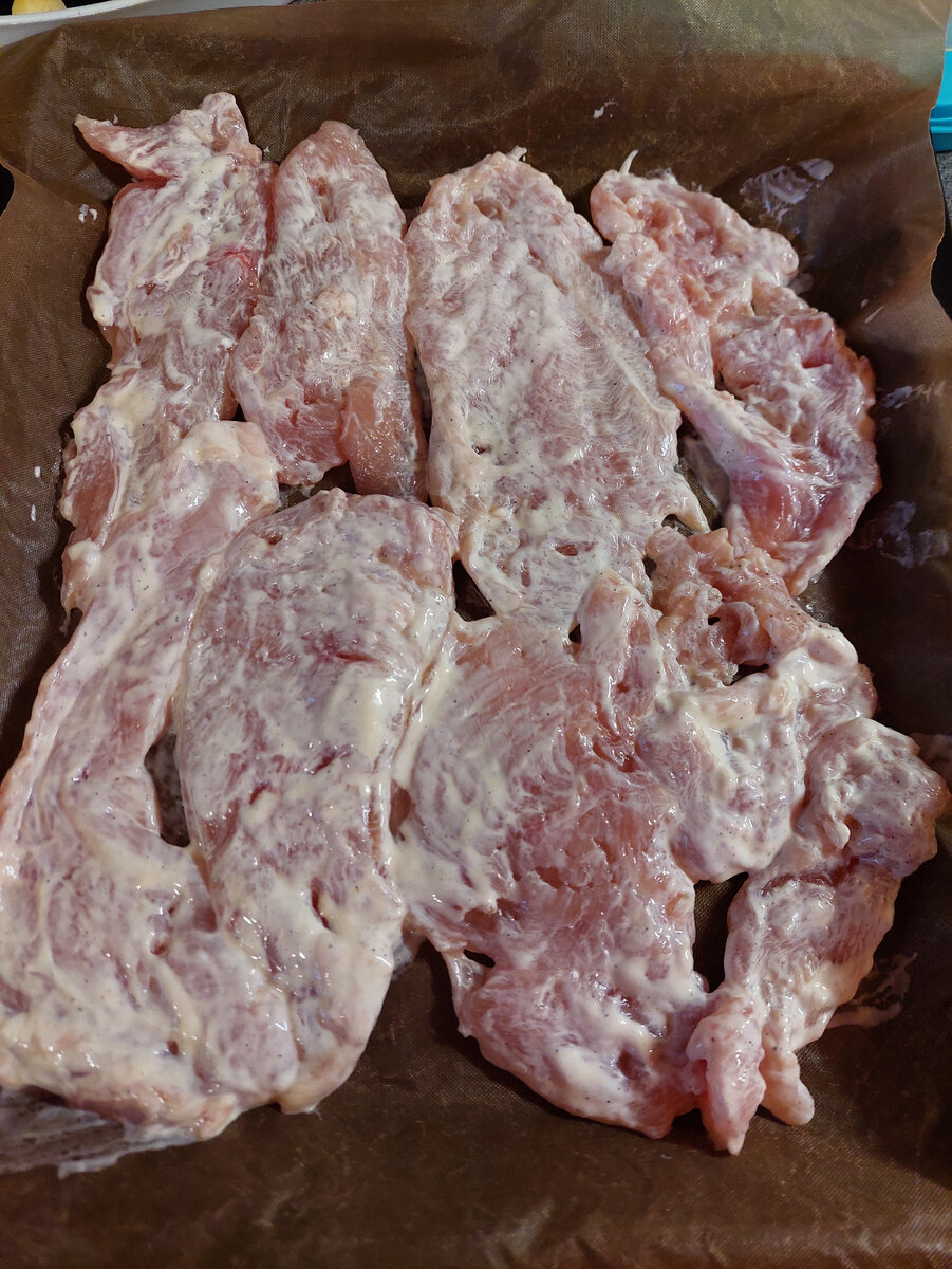 Думаю в каждой семье готовят мясо по-французки во всех возможных вариациях. У каждого свой семейный рецепт, также и в нашей семье. Но, когда совсем нет времени, я делаю ленивое мясо по-французки. Все банально и просто, для приготовления мне понадобится: Куриное филе (грудка) Лук репчатый 1 большая луковица Соль, перец Сыр Сметана Горчица Куриное филе нарезала на пластики, слегка отбила, посолила, поперчила. Сложила все в миску и добавила туда столовую ложку сметаны и чайную сладкой горчицы. Перемешала и дала постоять минут 5-10. А дальше, все как обычно, взяла противень, застелила силиконовый коврик и выложила на него куриное филе. Включила духовку на разогрев и принялась резать луковицу на полукольца. После выкладываю лук на мясо и отправляю в духовку минут на 20-25 на 180-200 градусов (для моей духовки). Когда мясо практически готово, я его достаю и посылаю мелко натертым сыром. Запеканка ещё минут 10-15 до золотистой корочки. А вы какое мясо используете: говядина или свинина? Кла