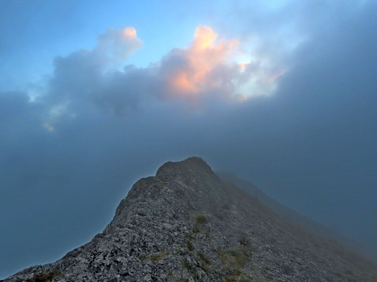 Уже где-то там, за тучами начинался закат. Нам доставались только небольшие его отблески. Серые сумерки начали все поглощать. Мы вернулись к палатке. С большим сожалением я вспомнила, что сегодня должно быть суперлуние. Немного погодя Виктор решил выйти на край обрыва. И вдруг сказал, что видит луну! Я решила, что это шутка, но взяла фотоаппарат и пошла к нему. И точно! Сквозь облака проглядывала луна. Кадр получился больше похожим на акварель. Фотоаппарат в тумане растерялся. Он не знал, на что надо наводить резкость. Это понимала и я, но не нажимать на кнопочку не могла. Приблизить и снять только луну, конечно же, получилось. Но ведь хочется все и сразу! Туман то затягивал все перед нами, то снова открывал небольшие порталы. В далеких домиках поселка уже зажглись огоньки. А мы стоим на скале, в темноте и в тумане, и пытаемся увидеть Голубую суперлуну. Все, что у меня получилось в туманной дымке с отблесками голубого цвета, это вот такая луна. Здесь я рассердилась и включила вс