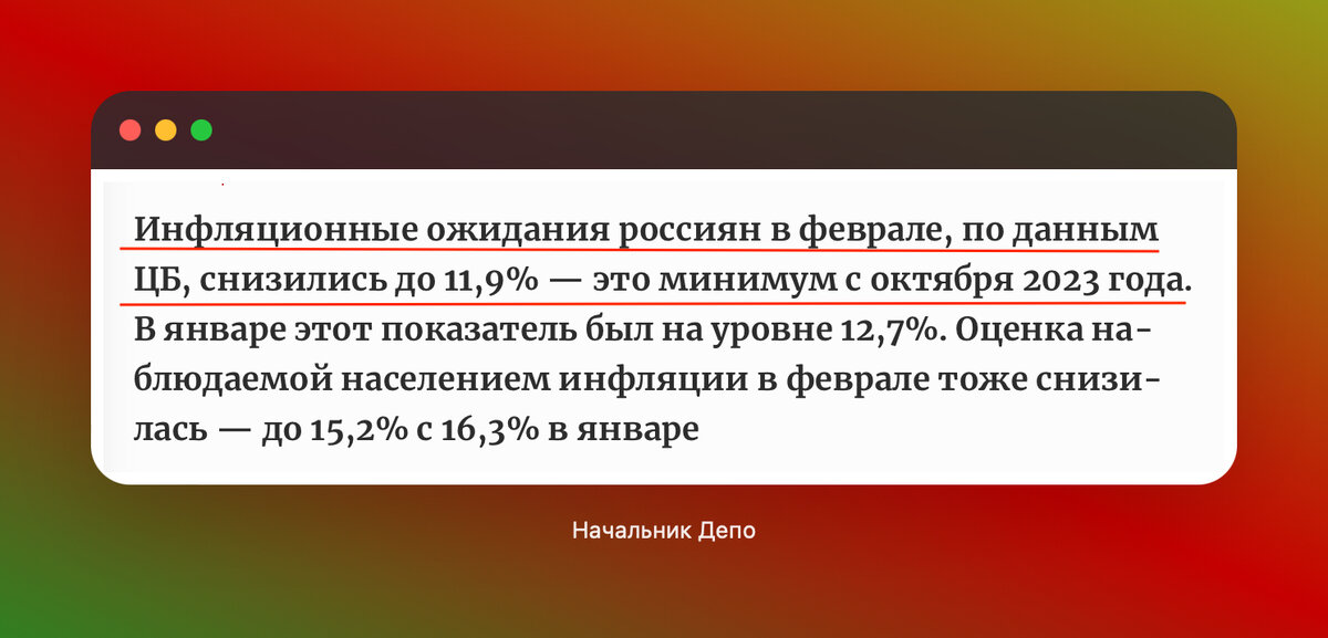 Завтра заседание ЦБ, а вчера вышли данные по инфляции. Она подросла, но снизились инфляционные ожидания А теперь вспоминаем мой выходной пост (он опубликован в моем ТГ канале ). Заботкин нам сообщил, что первое снижение ставки будет тогда, когда инфляционные ожидания вернуться на уровень 17-19 годов. Я немного покопался на сайте ЦБ и посмотрел какие эти ожидания были в оговоренный период. Я взял очень грубо, пускай это значение будет 9-10% Также, снижается наблюдаемая инфляция население 💭Считаю, что завтра будет мягкая риторика и намеки на снижение ключа на следующем заседании. Самое главное, что население страны ощущает снижение давления на цены. Электорат становится счастливее Если все пройдет в положительном ключе, как мне и кажется, то думаю после решения мы можем увидеть дальнейший рост рынка. Также, рынок будет поддерживать сезон дивидендов и отчетов. Многие компании, закончили год с отличными показателями Подписывайтесь на мой ТГ канал: https://t.me/+_lWjab7gLpMwZTli