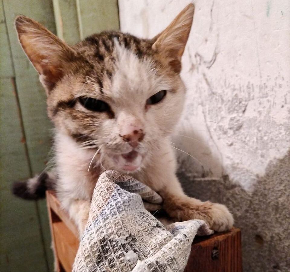 Женщина, обратившая внимание на "скелет в кошачьей шубке", занесла его в тёплый подвал и попыталась напоить и накормить. С этим ничего не вышло: изможденное животное лишь издавало хриплые стоны, сил на что-то большее просто не хватало сил.