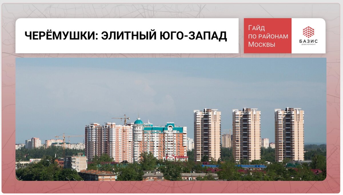 Черёмушки — район с экспериментальной жилой застройкой конца 1950-60х годов. Именно здесь начали массово возводить первые пятиэтажки. Со временем облик района постепенно начал меняться в сторону “элитной” части юго-западного округа. Здесь располагалась штаб-квартира компании “Газпром” (сейчас компания переехала в Санкт-Петербург), а рядом появились несколько крупных офисных центров. Это стимулировало спрос на жилье со стороны белых воротничков компаний. Из 330 жилых домов (на 2018 год) — почти половина приходится на пятиэтажки. При этом все из них (120 домов) включены в программу реновации. Таким образом к 2032 году облик район заметно изменится. Посмотреть новости реновации района можно на официальном сайте. В кварталах из пятиэтажек также встречаются панельные и блочные 9–13-этажные башни. Сегодня здесь осталось много зданий, построенных 40–50 лет назад, но появляется все больше современных жилых комплексов. На месте хрущевок, снесенных по предыдущей программе обновления жилого фонда