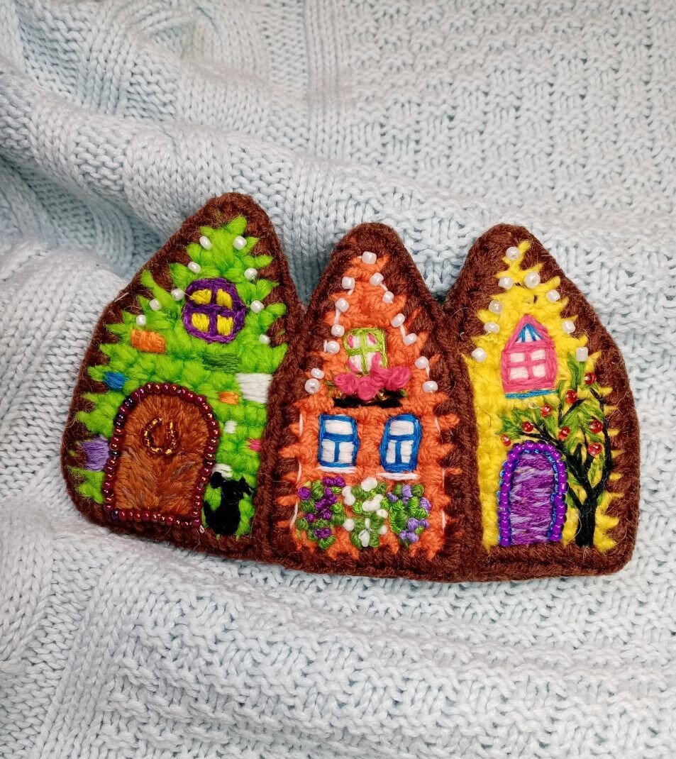 Вы верите в приметы? Или предсказания? Я вообще верю во всё. В черную кошку, в приход гостей после падения вилок или ножей, что нельзя сидеть на столе - вечер плохо закончится, про то, что правая рука чешется - здороваться будешь, а левая - к деньгам ( эта прям моя любимая, и сбывается 100%!!!). А симорон - это же отдельная наука о волшебстве. О, как и для чего мне пришлось мыть ноги в унитазе - я вам как нибудь расскажу. А пока о другом... Я твердо уверена, что существуют украшения, приносящие желаемое или помогающие исполниться мечте (главное сильно верить))). Вот например брошь домики. Много раз от разных любителей вышивки я слышала примету - хочешь дом, квартиру, дачу - вышей его сначала и обязательно обретешь. И ведь - правда! Огромное количество рукодельниц реально подтверждают сей факт. И с некоторыми я даже лично знакома. Ведь не зря все волшебники, эзотерики и прочие интересные люди говорят - в визуализации сила. Насколько мы позволяем себе мечтать, воображдать, фантазировать