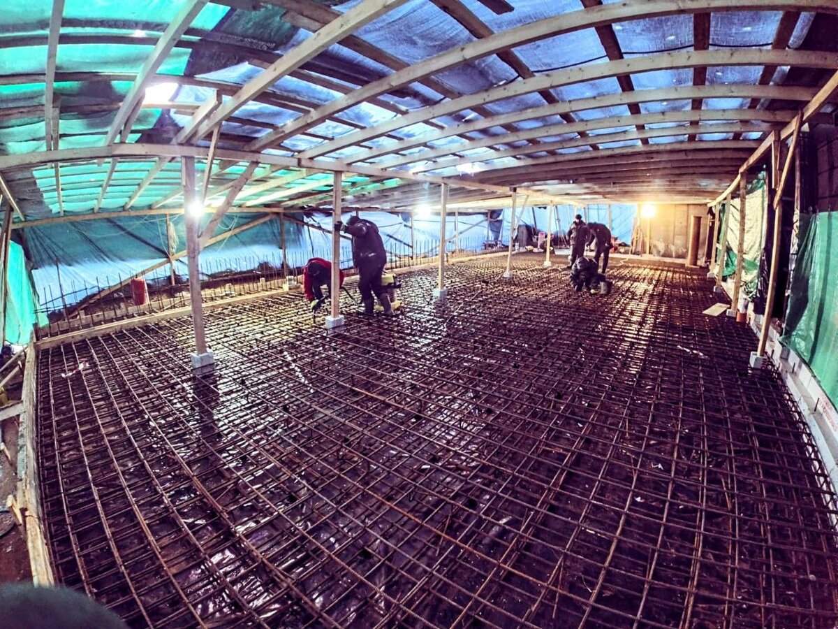 Многие опасаются строиться зимой, считая, что стройка в минусовые температуры может повлиять на качество будущего дома. Но на наших объектах даже зимой стройка продолжает кипеть, даже если на очереди бетонные работы. - Как так, - спросите вы, - в минусовые температуры ведь запрещено лить бетон? Для справки -при какой оптимальной температуре можно заливать бетон: От +5 до +20 градусов – нормальные условия для заливки бетона, приготовленного по стандартному рецепту. От нуля до +5 градусов – исключительно с использованием специальных добавок. От 0 до -20 градусов – со специальными добавками и прогревом. Идеальные условия – температура бетона +30 и воздуха +20, влажность до 100%. Именно поэтому прежде, чем начать работу мы выстраиваем на строительной площадке т.н. тепляк - шатер, обогреваемый строительными пушками. Для чего это нужно: 1. Защита от холода для самих наших рабочих: Теплое укрытие создает комфортные условия труда, позволяя строителям работать более эффективно и безопасно. 2.