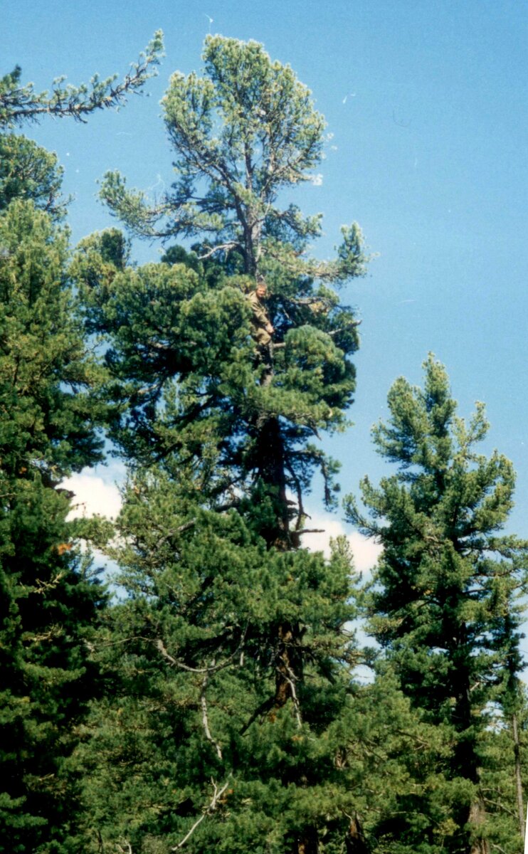 Из-за некоторого дефицита света кроны не очень густые, но плодоношение хорошее. Да и шишки неплохие. Теперь давайте перенесемся на Алтай, в его центральную часть, где находится Семинский хребет. Он располагается прямо поперек знаменитого Чуйского тракта. Там, где два линейных объекта пересекаются, находится Семинский перевал, где работали наши научные экспедиции, изучали структуру и динамику кедровых лесов. Центральный Алтай – это степной район. Кедровые леса там есть только в верхней части высотного профиля. Дерево с ВМ располагалось на высоте примерно 1500 м над уровнем моря. ВМ была обычная, ничем не примечательная. Посмотрим, каким получился производный от нее клон, который назван по месту происхождения