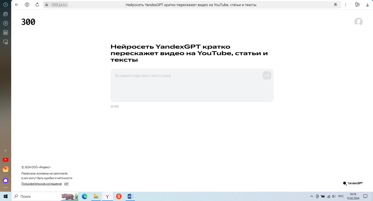 В Яндекс Браузере появилась функция краткого пересказа любого видео с помощью #Нейросети #YandexGPT. Очень интересная и полезная функция, достаточно быстро работает. Протестировала на своих видео и результат поразил! Действительно, нейросеть #YandexGPT делает краткий пересказ видео с таймкодами. Данный пересказ можно использовать, как описание своего же видео. Адрес сайта #Нейросети #YandexGPT: https://300.ya.ru/ . И выглядит следующим образом Сайт #Нейросеть #YandexGPT, интерфейс. Либо можно найти функцию краткого пересказа видео при просмотре видео в браузере #Яндекс. Кнопка "Пересказать" выделена розовым цветом вверху по середине видео. Если в видео только музыка и нет никакой речи, то #YandexGPT выдает соответствующий ответ. Есть видео, где также нет речи, но есть музыка и титры. В этом случае нейросеть не распознает титры в видео. Также протестировала видео, где много разной речи и шума. Когда копируем ссылку на пересказ и заходим уже по ссылке, то краткий пересказ с таймкодами
