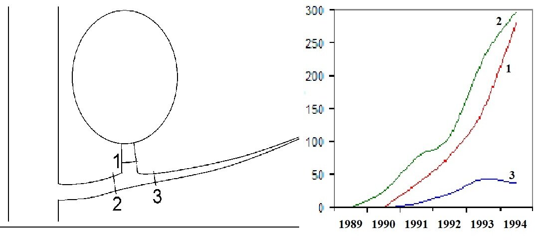 Слева схема: ствол дерева, боковая ветвь, ВМ на этой ветви. Цифрами (1, 2, 3) показаны места, где мы взяли срезы для измерения ширины годичных колец. Справа – динамика площади этих самых годичных колец в квадратных миллиметрах за последние 6 лет. Мы видим, что в год появления ВМ годичное кольцо в ее основании было такой же ширины, как и у материнской ветви. Однако в следующие 4 года прирост древесины в основании ВМ (красная линия) резко (в 12 раз) усилился. Параллельно он усилился в том отрезке материнской ветви, которая соединяла ВМ с остальной кроной (зеленая линия). В той части материнской ветви, которая не участвовала в связи ВМ с остальной кроной (синяя линия), прирост не изменился. Этот рисунок отлично показывает статус ВМ на породившем ее дереве. Она ведет себя как инородное и при этом очень агрессивное новообразование: сразу же замыкает на себя обмен веществ, становится локальным центром доминирования, активно растет и ветвится. Если кого-то всерьез заинтересует тема взаимоотношения ВМ с материнским деревом, то у нас есть на эту тему большая специальная статья: