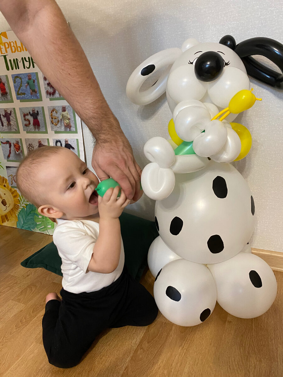 Мама заказала для Тимура воздушный шар единицу и собаку. Было видно, что шары впечатлили сына, он показывал на них пальчиком и ахал😅 У меня из детства страх лопающихся Шаров, я даже надувать их боюсь. Поэтому с опаской смотрела как Тимур играется с ними. Боюсь, что он случайно лопнет один из них и испугается.