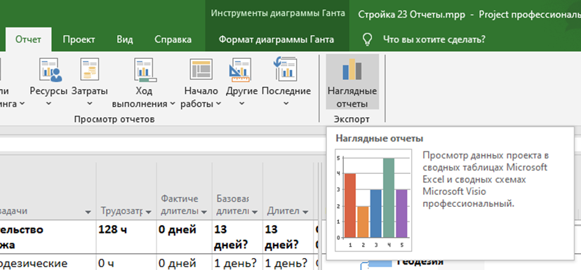 В состав MS Project входит большой набор готовых отчетов и панелей мониторинга с информацией о ходе разработки и выполнения проекта. В Части 1 Урока 23 сделан общий обзор подсистемы формирования отчетов MS Project. Там же, в Части 1, рассмотрено как выбирать наборы данных для формирования отчетов. В других Частях Урока 23 рассмотрены примеры работы с некоторыми вариантами готовых Отчетов. В Уроке 25 рассмотрены примеры создания Собственных Отчетов произвольной структуры В MS Project есть также инструментарий создания т. н. Наглядных отчетов в формате Сводных таблиц Excel или Сводных схем Visio. В Уроке 26 рассматриваем примеры создания Наглядных отчетов. В Части 1 Урока 26 рассмотрен пример создания Наглядного отчета. В Части 2 Урока 26 рассмотрим еще один пример создания Наглядного отчета из набора стандартных Наглядных отчетов. Откроем файл Стройка 23 Отчеты. (Этот файл является копией файла Стройка 11 Базовый план сохранен). Выполним команды Отчет – Экспорт – Наглядные отчеты Откро
