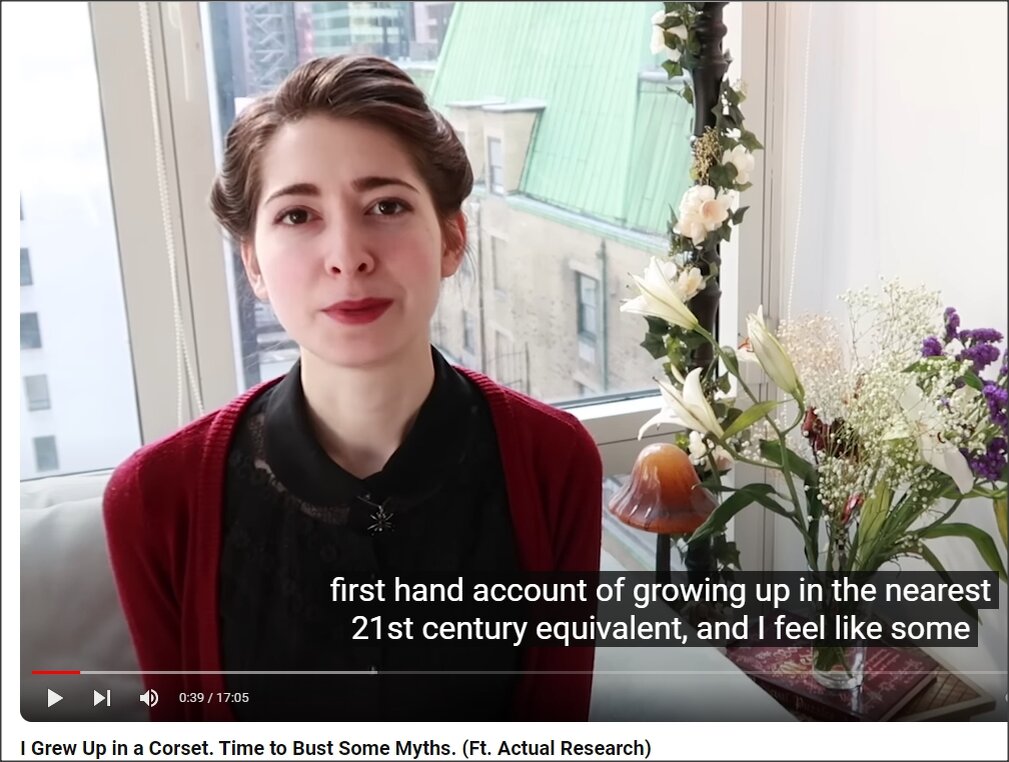 Пересматриваю старые видео Бернадетты, в которых она рассказывает про корсеты и свой опыт ношения в подростковом возрасте ортопедического корсета (от сколиоза). В интернете Bernadette Banner известна как одна из разоблачительниц "мифа" о вредности корсетов и прочее. Она, конечно, талантливая (и трудолюбивая), умеет подать материал артистично, исследовать и привести нужные данные, владеет языком и обладает чувством юмора. Главное, в чём она права, это в том, что многие люди делают выводы о корсетах, в том числе исторических, ничего о них не зная в практическом плане. Современных исследований нет, практического опыта у большинства людей тоже, - так откуда уверенные рассуждения о бедняжках в прошлом? При этом - tight lacing - сильная утяжка для ультрамодного силуэта и "обычное" ношение корсета - это разные вещи. Считается, что большинству людей не перетягивались, а носили комфортную утяжку на повседневной основе вплоть до небольшой совсем утяжки, чтобы корсет просто сидел и не ёрзал