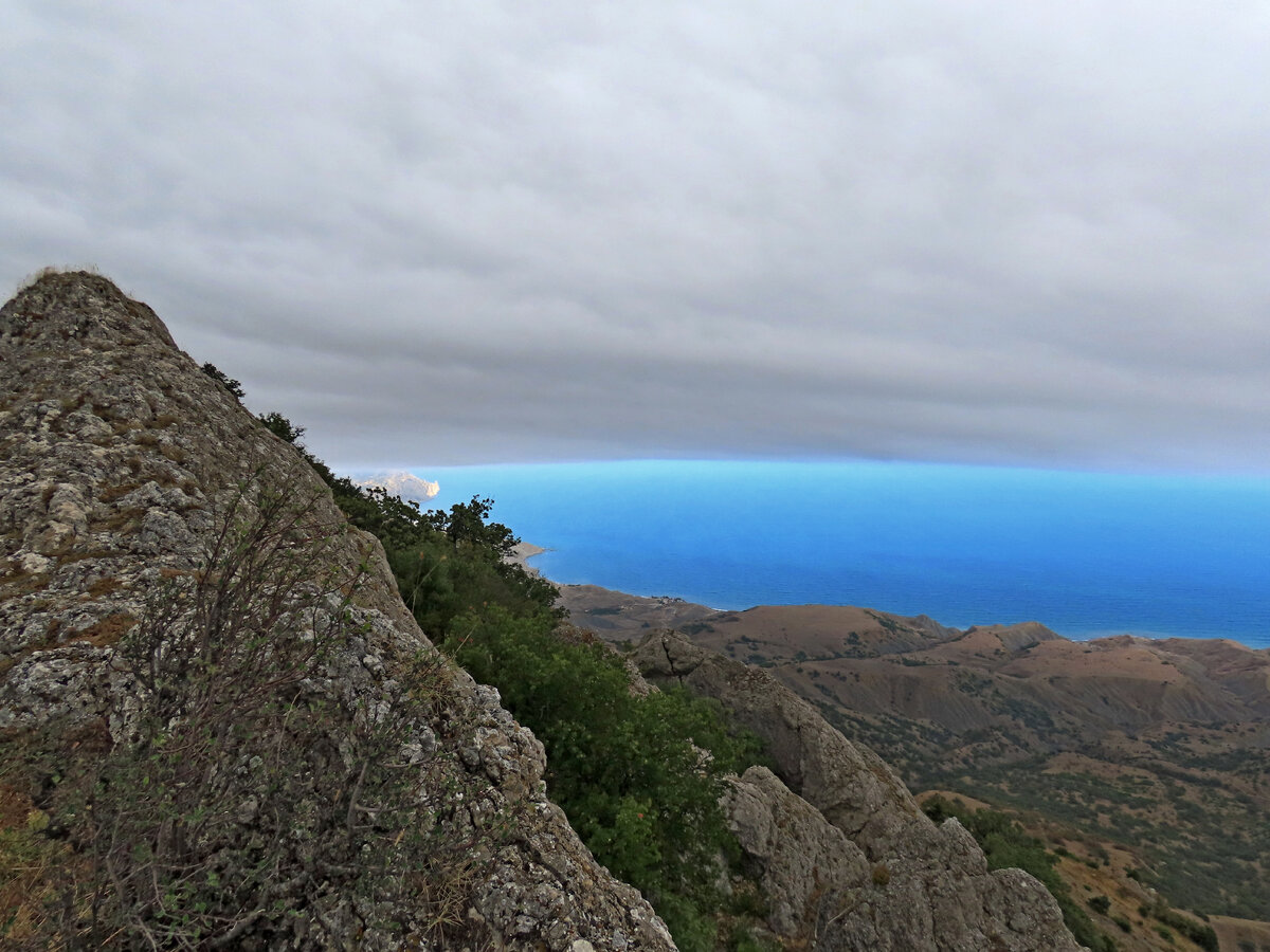 На подъеме, склон хребта закрывал нам вид на море. Мы ничего особенного и не ожидали. Глядя на космы по всему небу, мы ожидали дождя. Но, поднявшись, мы увидели невероятную картину! Над головой лежал серый и плоский блин. А внизу яркой бирюзовой полосой светилось море! А ведь я всегда пытаюсь доказать, что цвет моря не зависит от цвета неба! Оно само по себе! Немного осмотревшись, мы поняли, что сейчас происходит что-то удивительное у нас прямо на глазах. Этот большой, и плотный блин остановился. Ведь за нашими спинами вершины Эчки-Дага и они не дают ему двигаться горизонтально. Началось светопреставление! Эта огромная масса, замерев на миг, начала поднимать передний край над нашими головами и опускать вниз край, который над морем. Я не знаю, как это описать словами! Постепенно низ тучи закрыл Меганом. Он опускался все ниже, пока не перекрыл от нас море. Мы стояли на горе, а на нас, уже почти вертикально шла эта масса. Казалось, что она просто столкнет нас вниз. Это было неве