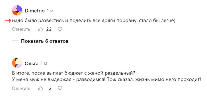 В комментариях к нашему материалу «Сколько лет нужно потратить, чтобы выбраться из долговой ямы? Я справился за 15» несколько человек написали о том, что можно было бы развестись и повесить половину долга на супругу, ведь кредиты брались в браке. Но это всего лишь распространенное заблуждение. И следует оно из недостаточной финансовой грамотности заёмщиков. По долгам мужа/жены второй супруг не отвечает. Хоть 3 раза разведись и 4 раза потом опять женись. Всё равно, что сам(а) занял, самому и отдавать. Либо должнику надо доказывать документально в суде, что занятые деньги пошли на общесемейные нужды. Без чеков и других подтверждающих документов сложно это доказать. И ещё существуют такие ситуации, когда кредитная задолженность делится между супругами не в равных долях. Давайте подробнее рассмотрим вопрос раздела кредита бывших супругов. Обратим внимание на 5 моментов Одним из вариантов раздела денежного долга перед банком является взаимное согласие о разделении кредита на части, наприме