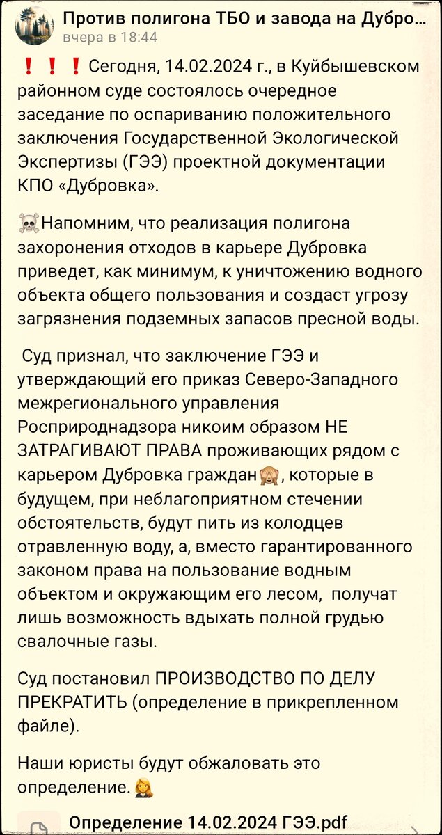 Привет, друзья! Уже очень давно хочу сесть и написать обстоятельный пост про ситуацию с нашей деревней и стройкой, но мне кажется, что там так много воддных данных, такая долгая история, что я никогда не возьмусь за него (надо было сразу все фиксировать)..... Поэтому, я решила ворваться в ваши ленты с новой темой и начать изложение с сегодняшнего дня как будто вы знаете предысторию и читаете продолжение:))) Почувствуйте себя впервые попавшими в мой блог, ведь именно так все и бывает, когда человек попадает в новое место: "Что?", "Кто?", "О чем речь?", "Что здесь происходит вообще?"... А происходит здесь вот что: Битва за карьер продолжается. Вчера суд принял решение не в нашу пользу. Но самое главное заседание состоится 7 марта 2024 года в Москве. На нем НЭО (Невский экологический оператор) будет оспаривать внесение обводненного карьера Дубровка в Государственный водный реестр (ГВР). В ноябре Арбитражный суд Санкт-Петербурга постановил, что дело должно быть рассмотрено по а