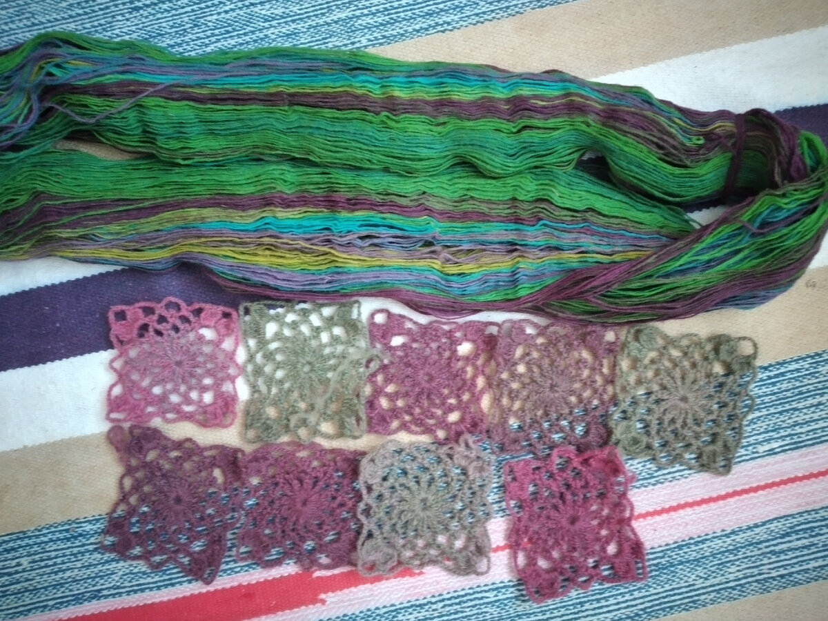 Приветствую читающих. Зимний пронизывающий ветер это не лучшая погода, не только для прогулок , но и вообще, просто пробежки до магазина. Такая погода бывает день, два, не больше. Поэтому повода для грусти нет. Дома столько деле непеределанных, про которые ты даже не подозреваешь, а как начнешь заниматься, так они прям эти дела не просто из каждого угла на тебя поглядывают, а набрасываются из каждого угла. И сбежать не куда, на улице - брррррр...... Опять буду участником " Мотивомании" . С отчетами, которые подгоняют и мотивируют энергичнее вяжется. А еще Светлана находит нужные слова для каждой участницы после фотоотчета . Прочитаю о себе и как та кошка, которой доброе слово приятно. От этих цветных переходов без ума. Перемотала в клубочки, нитки у меня получились разные, буду брать тот цвет что больше подходит уже к имеющимся мотивам. Что буду вязать? Сама еще не знаю. Была в восторге от палантинов, но в совместнике не вязала. Вязала два , но не из мотивов. А хочется из мот