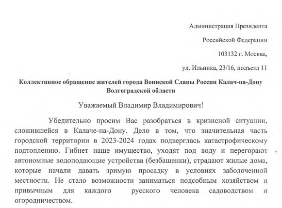 Жители Калача-на-Дону продолжают бить тревогу из-за затопления в городе. На этот раз они решили обратиться за помощью к Владимиру Путину. Об этом местные жители сообщили «Блокноту» сегодня, 15 февраля.