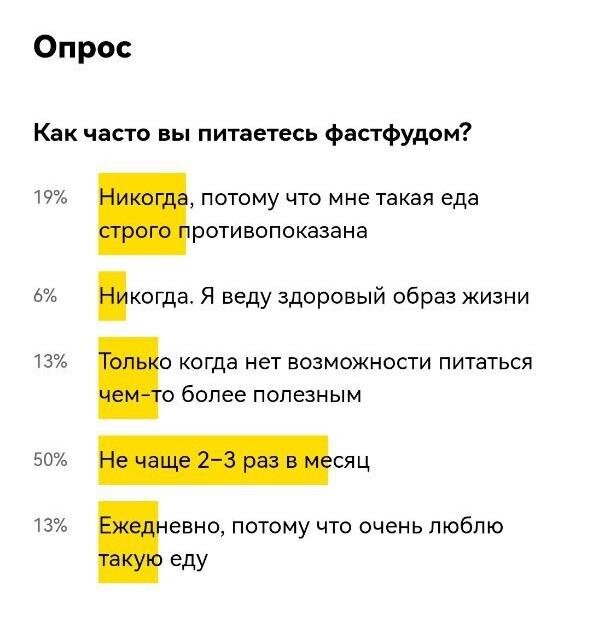 Каждый четвертый нижегородец не употребляет в пищу такую еду. 25% участников опроса, организованного на сайте ИА «Время Н», заявили, что никогда не питаются фастфудом. 19% респондентов не делают этого, потому что им такая еда противопоказана. 6% привыкли вести здоровый образ жизни. Каждый второй участник опроса питается фастфудом не чаще 2−3 раз в месяц. 13% - только тогда, когда нет возможности питаться чем-то более полезным. 13% респондентов заявили, что питаются фастфудом регулярно. Как сообщила ИА «Время Н» заведующая гастроэнтерологическим отделением ГБУЗ НО «НОКБ им. Н.А. Семашко» Елена Колодей, большинство людей до появления явных симптомов не задумываются о здоровье ЖКТ.
