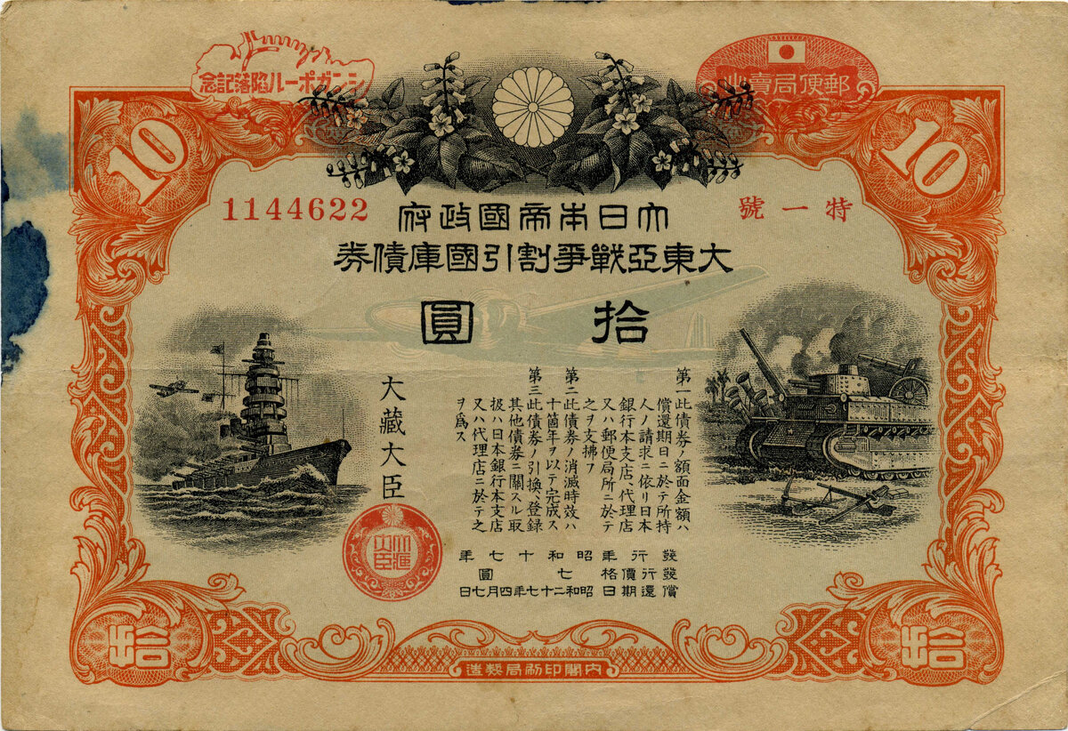 大東亞戰亊割引國庫債嘖券 - Daitōa senji waribiki kokko saisakusen - 10% казначейская облигация войны в Великой Восточной Азии.