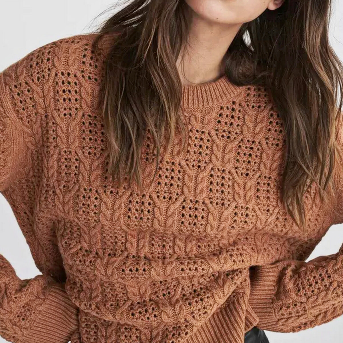 Симпатичный коричнево-рыжий свитер с красивым ажурным узором и широким воротником-хомутом.