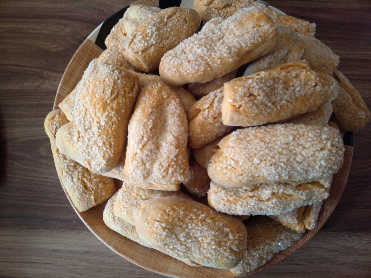 130мл кефира( я заменила на айран, но можно использовать сыворотку или иное...), 1яйцо, ⅓ч.л.соли, 1ст.л.сахара, 80 мл растительного масла- всё смешать+ 1ч.л.разрыхлителя и 300 гр просеянной муки. Замешиваем мягкое тесто. Делаем жгутики по 16 грамм и затем прижимаем одну сторону( чтобы напоминали Савоярди), обмакнуть с 1ой стороны в сахар, прижав. Выкладываем на бумаге и ставим в разогретую духовку 180° на 25 мин ,до лёгкой румяности.