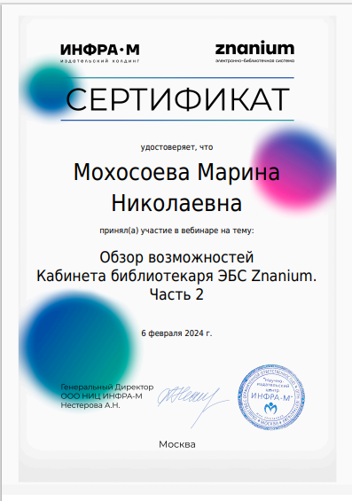 Доцент кафедры английского языка для экономических специальностей, кандидат филологических наук Марина Мохосоева приняла участие в вебинаре на тему «Обзор возможностей кабинета библиотекаря ЭБС Znanium”. Мероприятие состоялось 6 февраля.