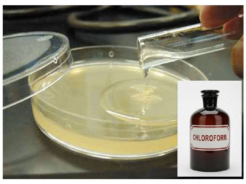 Органические растворители, например хлороформ, толуол, ксилол, ацетон или эфир, убивают бактерии кишечной группы почти немедленно. Действие их на другие микроорганизмы не столь эффективно. Хлороформ удобен тем, что он не огнеопасен. Его часто используют при приготовлении бульона, добавляя к бульону до конечной концентрации 1,5% (по объему). Пары хлороформа также обладают бактерицидным действием. Поэтому консервацию бактериальных колоний или стерильных пятен фагов можно осуществить, нанося несколько капель хлороформа на крышку стерильной чашки Петри и инкубируя их в течение 30 мин при комнатной температуре. Следует помнить, что пластмассовые крышки растворяются в хлороформе. Кратковременное действие хлороформа (до минуты) можно с успехом применить при необходимости убить «роящиеся» микроорганизмы, растущие на поверхности плотных питательных сред.