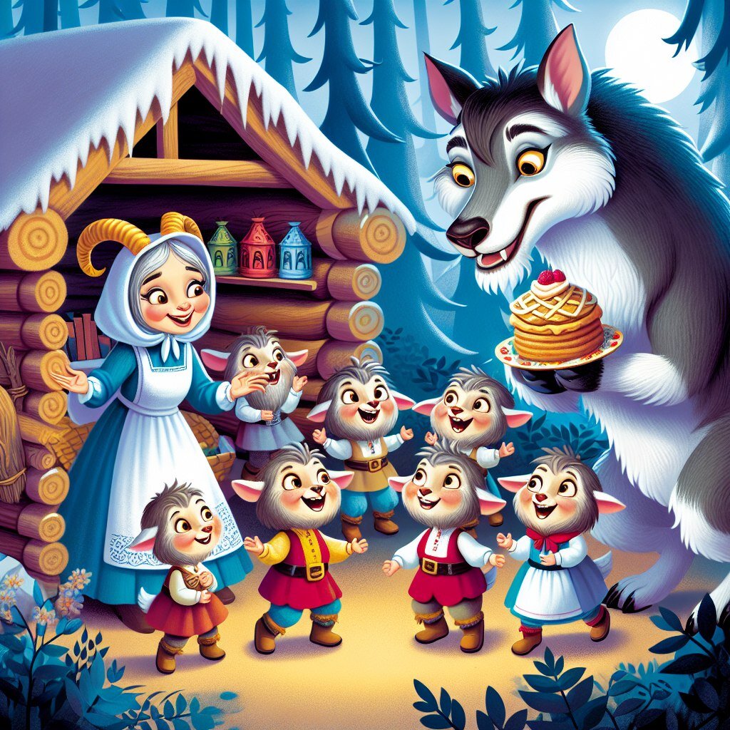 Жили-были в чудесной стране под названием Лес, под звёздным небом и пушистыми облаками - семеро забавных козлят и их мудрая мама коза Алла Михайловна. Она была мастерицей на все руки: то плетёт уютные вязаные носочки для малышей, то волшебным мармеладом балует. Их домик с красивой крышкой, как у конфетной коробки, всегда блестит от чистоты. Каждый козлёнок был тоже молодец: старший Миша любил игры в шахматы, тащил короля прямиком на восьмую дорожку. Нюша умело крутила перед зеркальцем свои кудряшки и помогала другим, а Жорик пирожки пёк по своему особенному рецепту. Люся — самая миловидная, друзей в лесу нашла немало. Серж — настоящий художник, кистью и красками умело махал. Софа — прыгучая как шарик, утро каждое весёлой зарядкой начинает. А малыш Ваня настоящий выдумщик — как только помидорчики и огурчики на своей грядке появлялись, то сразу овощам даёт имена. Волк Петрович жил в соседнем доме и давно хотел проверить, сможет ли он пробраться в домик козлят и полакомиться пирожками