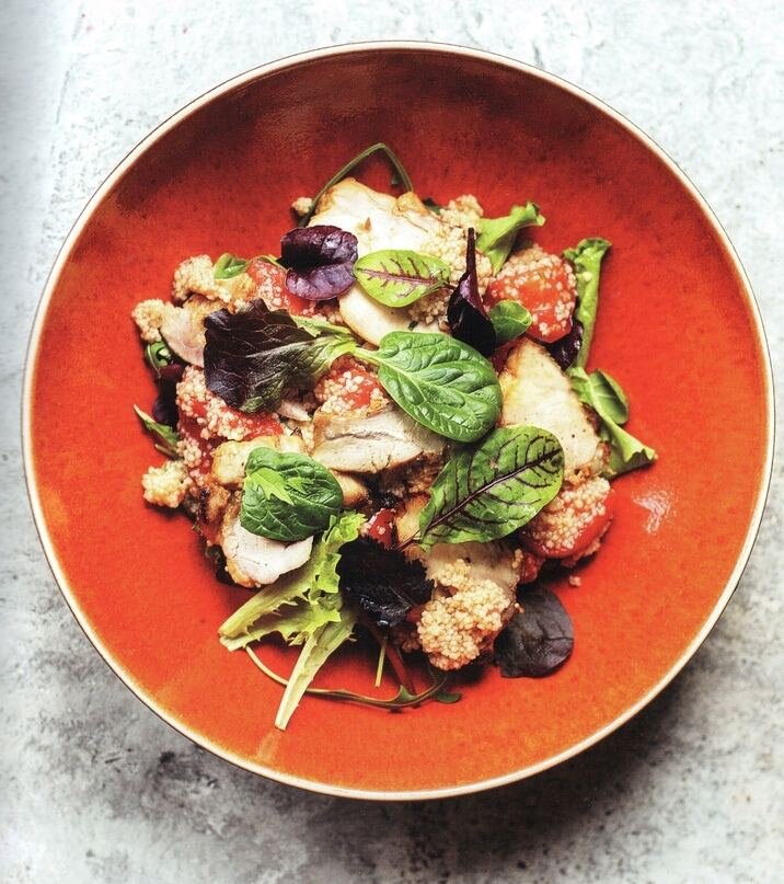 На 4 порции Кускус - 80 г. Куриные бедра - 400 г. Сладкий перец — 1 шт. (около 230 г.) Микс салатов - 80 г. Молотая паприка — 2 г. Минеральная вода — 200 мл. Оливковое масло — 100 мл. Бальзамический уксус - 20 г. Мед -10 г. Соль — 7 г. Кускус залить кипятком в пропорции 1:1, накрыть крышкой и варить 5 минут. Куриные бедра замариновать с молотой паприкой, солью (5 г), минеральной водой и оливковым маслом (50 мл) на 20 минут. Обжарить на раскаленной сковороде в течение 10 минут, постоянно переворачивая. Сладкий перец запечь в духовке (180 градусов, 15 минут), остудить, очистить от семян и снять кожу. Нарезать произвольно крупными кусочками Для заправки смешать бальзамический уксус, мед, оставшееся оливковое масло и соль, хорошо взбить венчиком до однородной консистенции. Все ингредиенты соединить, добавить микс салатов, аккуратно перемешать и выложить на тарелку.