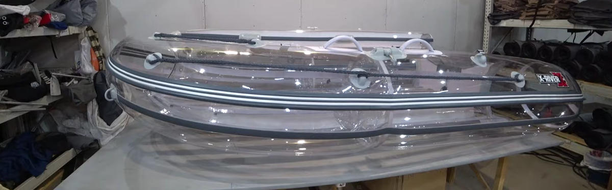 Лодка, которая не имеет аналогов в мире (так заявляет производитель). Не игрушка для витрины, а настоящая прозрачная "надувнушка" — с транцем для подвесного мотора. А вот это, кое-что не обычное... Давайте рассмотрим лодку и обсудим подробности. Лодка создана в России, по оригинальному проекту компании X-RIVER. Этой модели присвоено название X-RIVER "Rocky 355". Не торопитесь искать в каталогах магазинов, в продажу она пока не поступила. Есть ли сейчас аналогичные лодки?.. Таких — нет! А какие (из прозрачных) есть?.. Давайте сначала пробежимся по разным вариантам, а затем рассмотрим представленный образец более детально... Был выставочный образец, который "засветили" (года полтора назад) на Ютубе, увидев его на производстве X-RIVER. Но, та лодка не предназначалась для эксплуатации. Тем более, она бы не выдержала эксплуатацию с мотором (хотя имела вклеенный транец). Было заявлено, что это всего лишь образец для витрины. Посмотреть, потрогать, затушить сигарету (лопата)... Ниже с