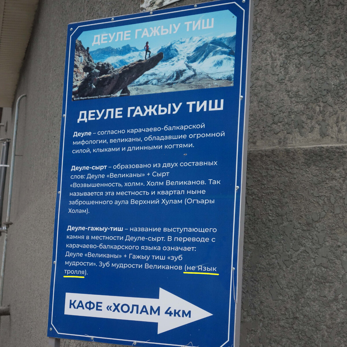 А как правильно? Жители Верхней Балкарии настаивают, что необычная природная достопримечательность в 4 км от селения Безенги называется Деуле Гажыу Тиш, что в переводе с карачаево-балкарского языка означает «Зуб мудрости Великанов». На повороте к Зубу даже висит информационная табличка, где специально подчёркнуто - НЕ ЯЗЫК ТРОЛЛЯ. Такая аутентичность заслуживает огромного уважения! В России итак уже четыре «Языка тролля» 😂 - два в Дагестане (рядом с Сулакским каньоном и в ауле-призраке Гоор), один в Крыму (в Морском), ещё один в Адыгее - на горе Казачьей (рядом с Гузерипль), сколько можно? Балкарцы протестуют, давайте поддержим. К тому же и за норвежский Язык тролля обидно, он уникальный, а к его славе постоянно пытаются примазаться. Для справки: трекинг к Языку тролля на горе Скьеггедаль в одну сторону занимает около 14 км! 😄 Доберутся только герои. Он «высунут» надо озером, его длина 10 метров, пропасть под ним - 700 метров. Балкарский Зуб не так труднодоступен, мы очень близко н