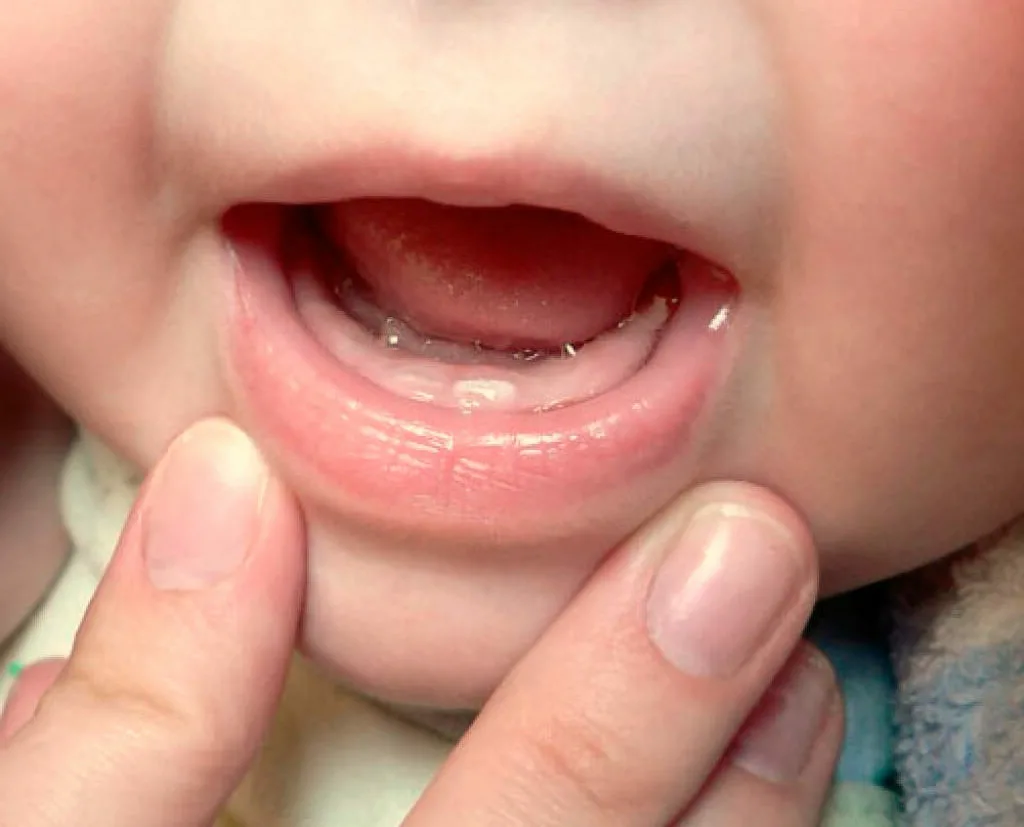 Если посмотреть в ротик, можно увидеть отечные и покрасневшие десны, увеличение размеров десен в местах проекции будущих зубиков и обильное выделение слюны. Слюна выполняет функцию защитного фактора и обезвреживает микробы в полости рта. Прорезавшимся будет зубик, который появился хотя бы одним краешком и «стучит по ложке».