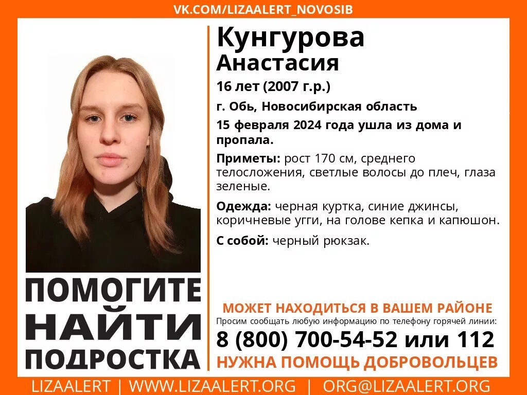 В городе Обь Новосибирской области 15 февраля пропала 16-летняя местная жительница Анастасия Кунгурова. Она вышла из дома и направилась в школу, но по дороге пропала, а домой так и не вернулась. «На горячую линию «ЛизаАлерт» поступила заявка о пропаже девочки 2007 года рождения. Сегодня, 15 февраля, она пропала по пути в школу. Группа распространения информации ДПСО «ЛизаАлерт» Новосибирской области занимается размещением ориентировки в сети для получения свидетельств о возможном местонахождении пропавшей и определения плана дальнейших действий», — сообщает НДН.инфо представитель отряда Ольга Бобкова. Приметы Анастасии: рост 170 см, среднее телосложение, светлые волосы до плеч, зеленые глаза. Была одета: черная куртка, синие джинсы, коричневые угги, кепка и капюшон на голове. Всех, кто владеет информацией о местонахождении Анастасии, просят позвонить по телефонам 112 или 8 800 700-54-52. Марк Светов