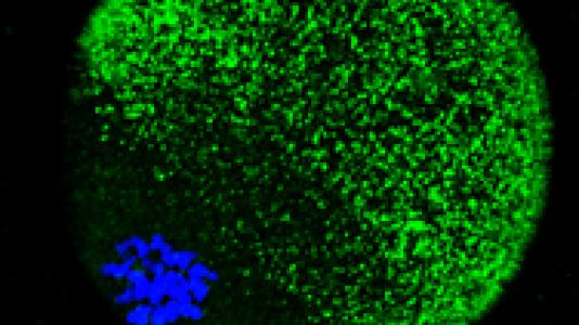 В исследовании, опубликованном в журнале Nature Chemistry, исследователи Северо-Запада обнаружили, что в яйцеклетке млекопитающих цинк хранится в крошечных пакетиках чуть ниже поверхности клетки. Эти пакеты высвобождаются волнами после оплодотворения в ходе событий, называемых «цинковыми искрами». Это флуоресцентное изображение яйца, помеченного цинком (зеленый) и ДНК (синий), показывает, как яйцо хранит цинк в тысячах крошечных упаковок. Они высвобождаются во время оплодотворения, образуя цинковую искру.