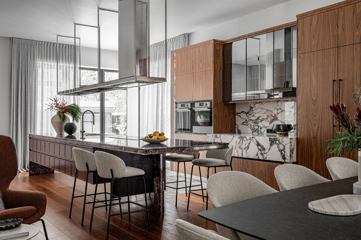 - остров: столешница из мрамора Rosso Levanto со встроенной системой хранения и фасады с фрезеровкой, имитирующей шоколад, покрытые матовой эмалью, а цоколь из полированной нержавеющей стали с подсветкой подчёркивает объём