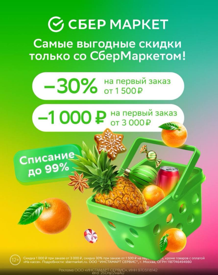 🩷Промокоды на первые заказы в СберМаркет 🔥Скидка 1 000 руб. по промокоду wlg6rb56h (от 3 000 руб.) 🔥Скидки до 30% по промокоду eeu7txns2 (от 1 500 руб.) 🔥Скидка 1 000 руб. в СберМаркете в Аптеках при заказе от 2 000 руб. попромокоду mapegegt2 🔥Переходи по ссылке https://gtblg.ru/mt3dP3?erid=2SDnjdK1GKr Скидка 900 ₽ при заказе в ресторанах от 2 000 ₽ по промокоду potmrbwok 📍Еще больше ПРОМОКОДОВ в нашем телеграм канале https://t.me/skidkimarketru